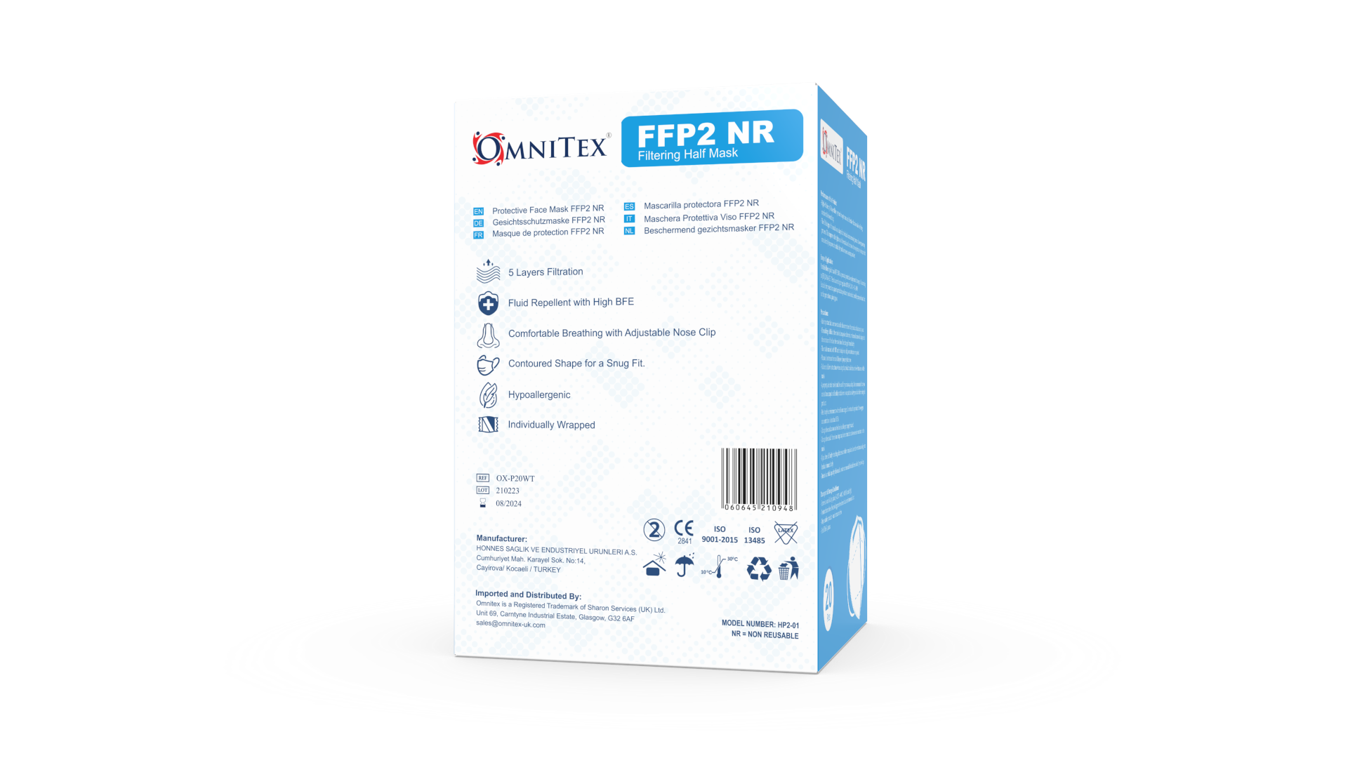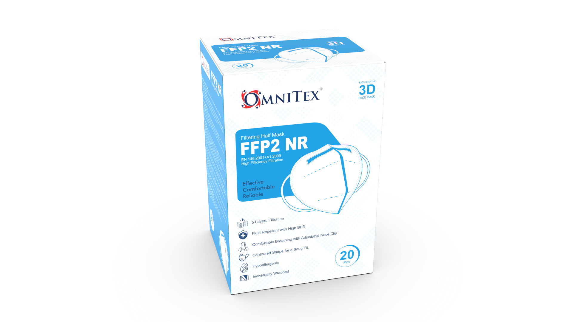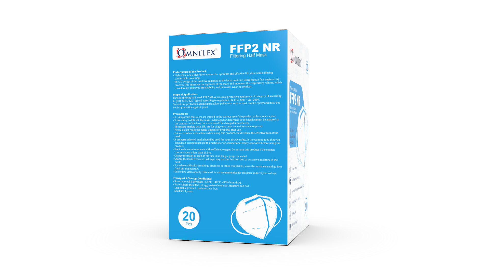 De Omnitex FFP2 Gezichtsmasker voldoet aan de Europese FFP2-regelgevingsnormen EN149: 2001 + A1: 2009, CE-gecertificeerd. Door de hoge kwaliteit, latexvrij, hypoallergeen, vloeistofbestendig masker met oorlussen en vormbare neusbrug ervaren gebruikers deze gezichtsmasker als erg prettig.