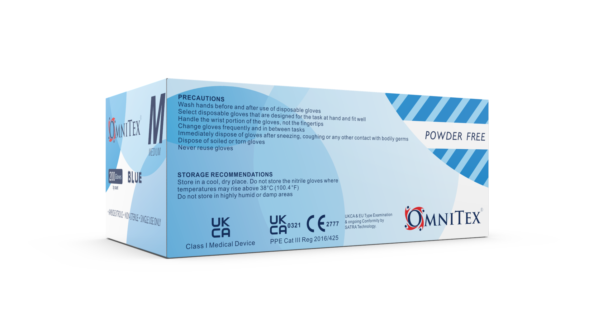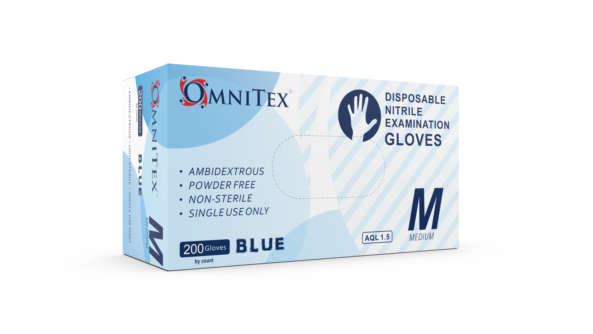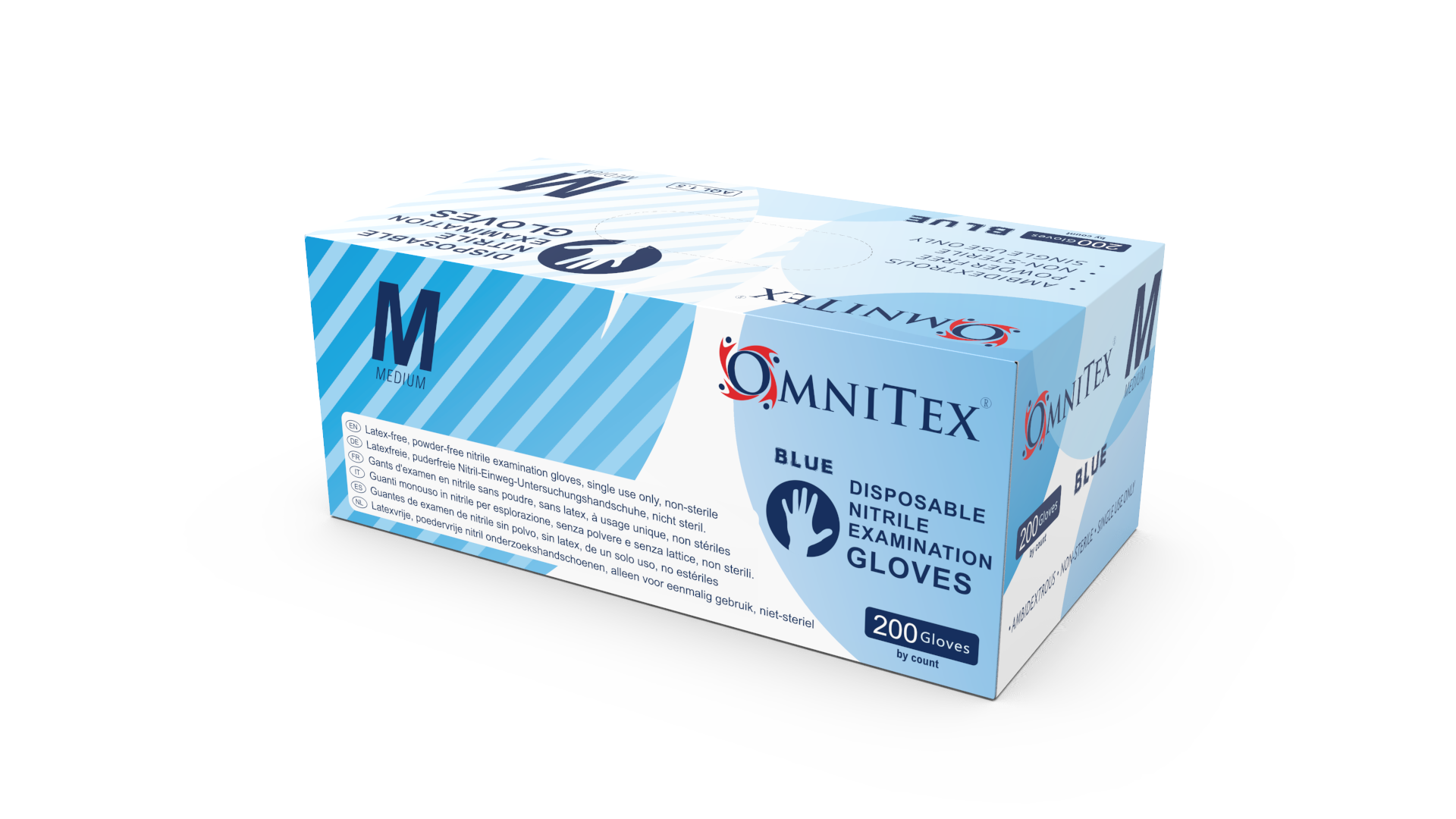 De blauwe Nitril wegwerphandschoenen van Omnitex zijn beschikbaar is verschillende maten en worden per 200 stuks geleverd.
