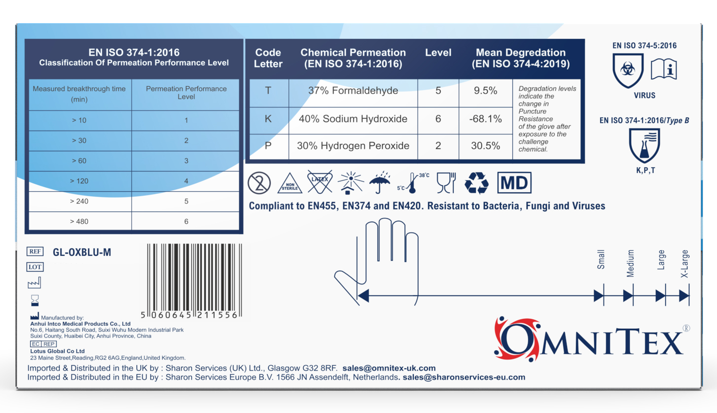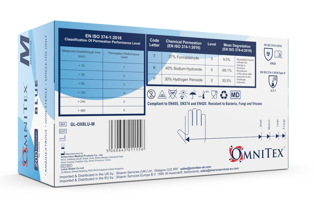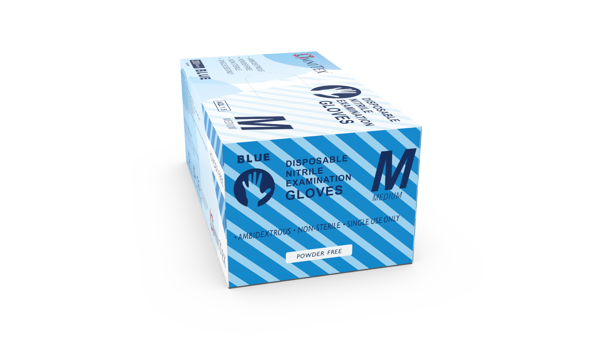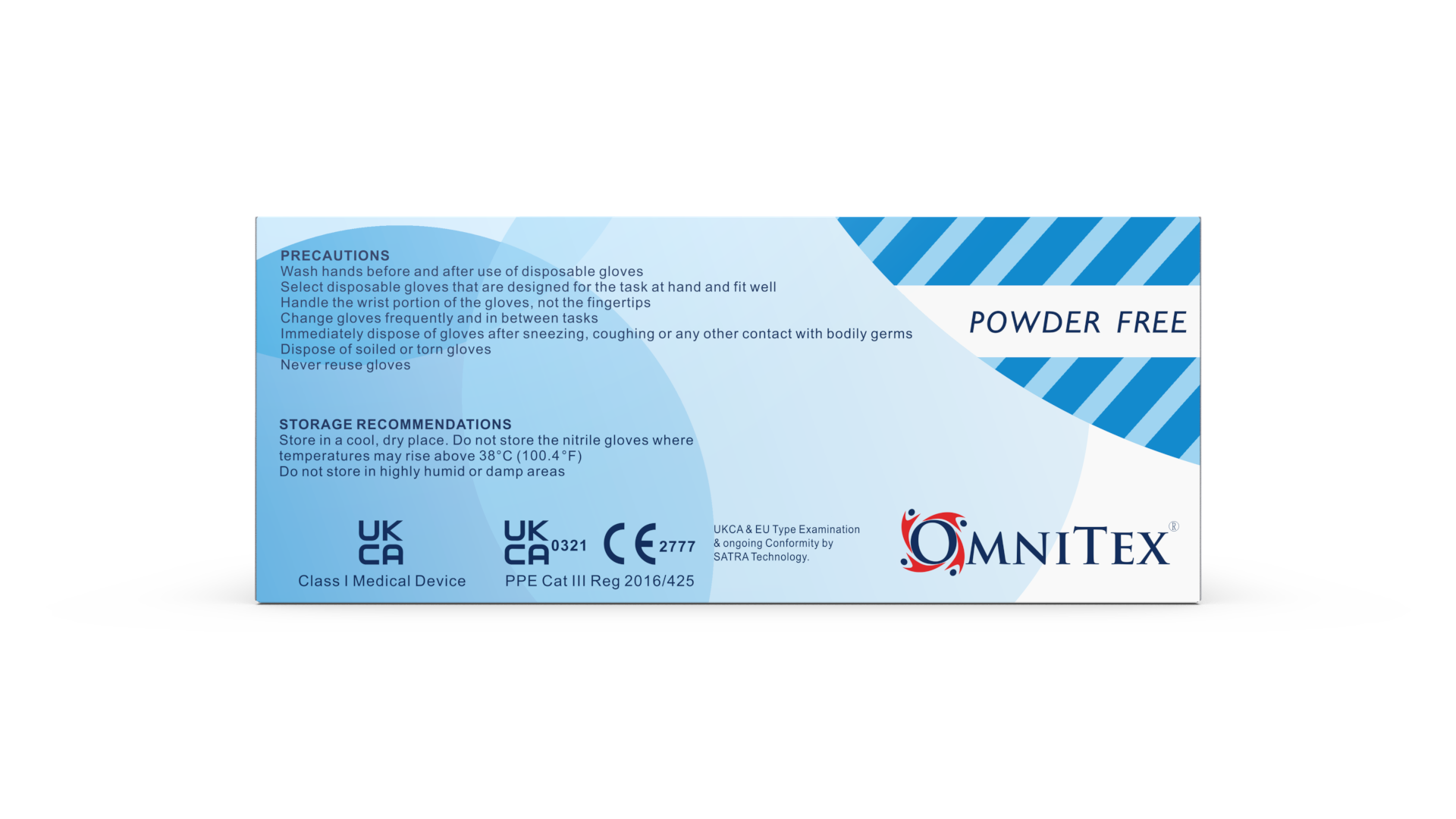 De blauwe Nitril wegwerphandschoenen van Omnitex zijn beschikbaar is verschillende maten en worden per 200 stuks geleverd.